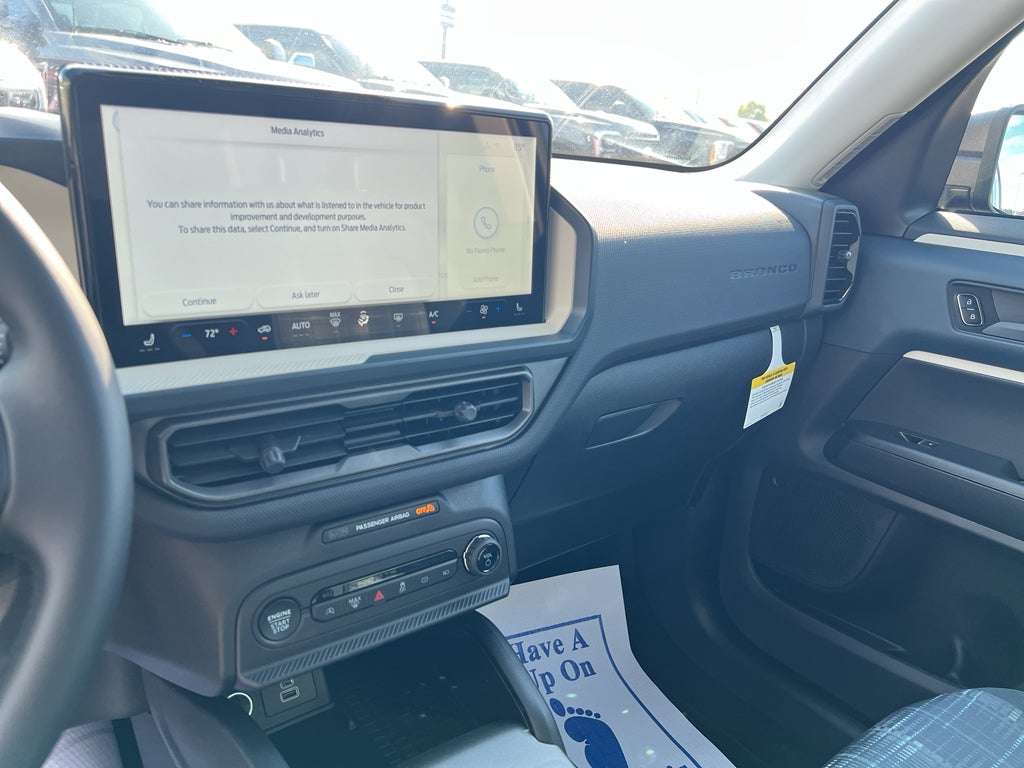 This vehicle offers Automatic Climate Control for personalized comfort. This model has automated speed control that adjusts to maintain a safe following distance, enhancing highway driving convenience. Start this model from inside with remote start. The Ford Bronco Sport offers Android Auto for seamless smartphone integration. The rear parking assist technology on this 2025 Ford Bronco Sport will put you at ease when reversing. The system alerts you as you get closer to an obstruction. See what's behind you with the back up camera on this mid-size suv. This model offers Apple CarPlay for seamless connectivity. Bluetooth® technology is built into this Ford Bronco Sport, keeping your hands on the steering wheel and your focus on the road. When you encounter slick or muddy roads, you can engage the four wheel drive on it and drive with confidence. Set the temperature exactly where you are most comfortable in this 2025 Ford Bronco Sport . The fan speed and temperature will automatically adjust to maintain your preferred zone climate.
