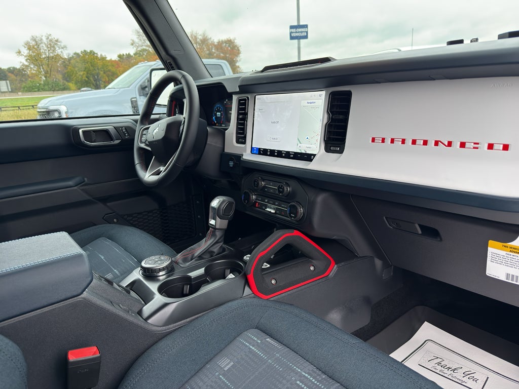 An off-road package is equipped on this Ford Bronco. This model's Cross-Traffic Alert: Safeguarding you from unexpected traffic when reversing. This vehicle is pure luxury with a heated steering wheel. You'll never again be lost in a crowded city or a country region with the navigation system on the Ford Bronco. Bluetooth® technology is built into it, keeping your hands on the steering wheel and your focus on the road. Start this vehicle from inside with remote start. This unit keeps you comfortable with Auto Climate. This 2025 Ford Bronco comes equipped with Android Auto for seamless smartphone integration on the road. This unit offers Apple CarPlay for seamless connectivity. Protect this vehicle from unwanted accidents with a cutting edge backup camera system. It is equipped with all wheel drive. The vehicle projects refinement with a racy metallic gray exterior. Set the temperature exactly where you are most comfortable in this vehicle. The fan speed and temperature will automatically adjust to maintain your preferred zone climate.