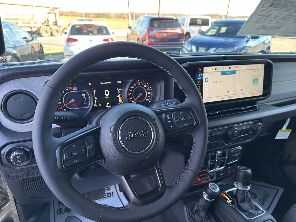 Convenience Group: Emergency/Assistance Call; Front Door Locks 2-Door Passive Entry; Remote Start System; Body Color Fender Flares (2-Piece); Cluster 7.0" TFT Color Display; Universal Garage Door Opener; Daytime Running Lamp System; Heated Front Seats; Air Conditioning W/Auto Temp Control; Heated Steering Wheel; Corning Gorilla Glass. Quick Order Package 24W Willys: LED Taillamps; Protection Sill Rails; 4-Wheel Drive Decal; Black Grille; MOPAR All-Weather Slush Mats; LT255/75R17C OWL On/Off Road Tires; Body Color Fender Flares (2-Piece); Front Heavy Duty Red Accent Shock Absorbers; Daytime Running Lamps LED Accents; Front LED Fog Lamps; LED Premium Reflector Headlamps; E-Locker Rear Axle; Corning Gorilla Glass; Trailer Hitch Zoom; Class IV Receiver Hitch; Security Alarm; Mold In Color Bumper W/Gloss Black; Advanced Brake Assist; Willys Suspension; Heavy Duty Engine Cooling; Automatic Headlamps; Air Conditioning W/Auto Temp Control; 5. 950 lbs GVWR; Deep Tint Sunscreen Windows; Off-Road Plus Mode; 17" X 7.5" Painted Black Wheels; Willys Hood Decal; Full Speed Forward Collision Warning Plus; Rear Heavy Duty Red Accent Shock Absorbers; Front Door Locks 2-Door Passive Entry; Cluster 7.0" TFT Color Display; Power Heated Mirrors; Auxiliary Switches; Premium Wrapped Steering Wheel; Sun Visors W/Illuminated Vanity Mirrors. Black 3-Piece Hard Top. 41. MOPAR Spray In Bedliner. **Equipment listed is based on original vehicle build and subject to change. Please confirm the accuracy of the included equipment by calling the dealer prior to purchase.**